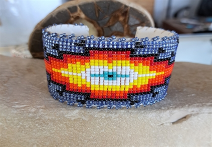 Bracelet en perlage sur cuir et métal.